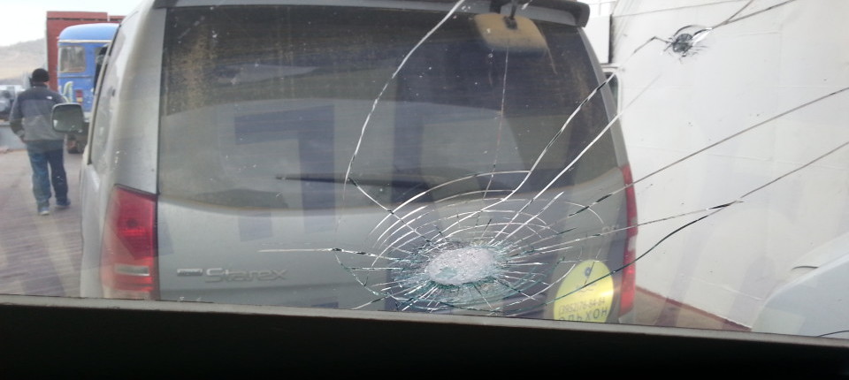 Ponownie kierowca pędził jak oszalały, wyprzedzając wszystkie inne pojazdy i robiąc slalom pomiędzy krowami na nierównej szutrowej drodze. Nawet nie wiecie jak współczuliśmy upchanym jak sardynki ludziom z tyłu. Ruski kierowca-morderca nie zna strachu. Przy jednym z pozbawionych zdrowego rozsądku manewrów spod kół mijanego samochodu wystrzelił kamień i huknął w szybę na wysokości naszych oczu. Posypały się na nas drobinki szkła, ale nabój nie przedostał się do środka pozostawiając strzaskaną szybę z pajączkiem rozchodzącym się po całej jej prawej stronie. A my akurat minutę wcześniej wyłączyliśmy GoPro! Wyraz twarzy kierowcy podczas tego zdarzenia zmieniał się równie mocno jak mimika Sylvestra Stallone przez całą karierę. #john_rambo